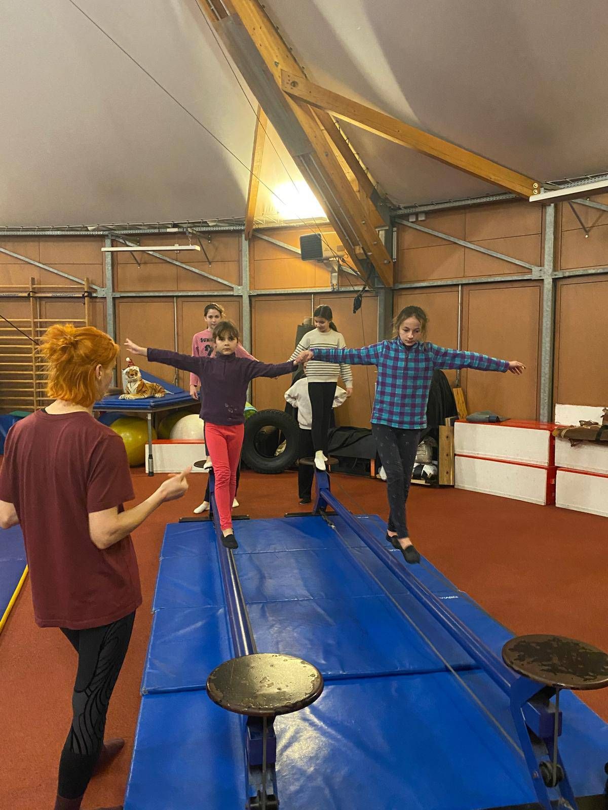 Ils et elles découvrent l'acrobatie : discipline pertinente pour développer la motricité et la situation dans l'espace. L'équilibre sur objet est aussi au programme ainsi que le jonglage !